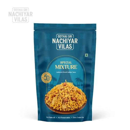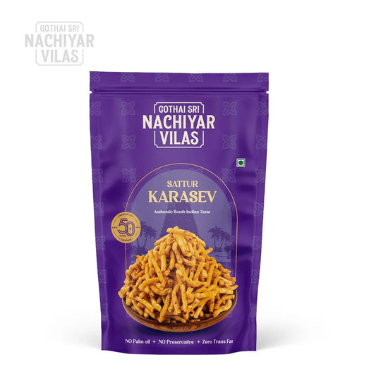 Thin, ribbon-like strips made of rice flour and besan, fried crisp and light. It has a gentle spice and a perfect crunch, which makes it disappear quickly from the box.